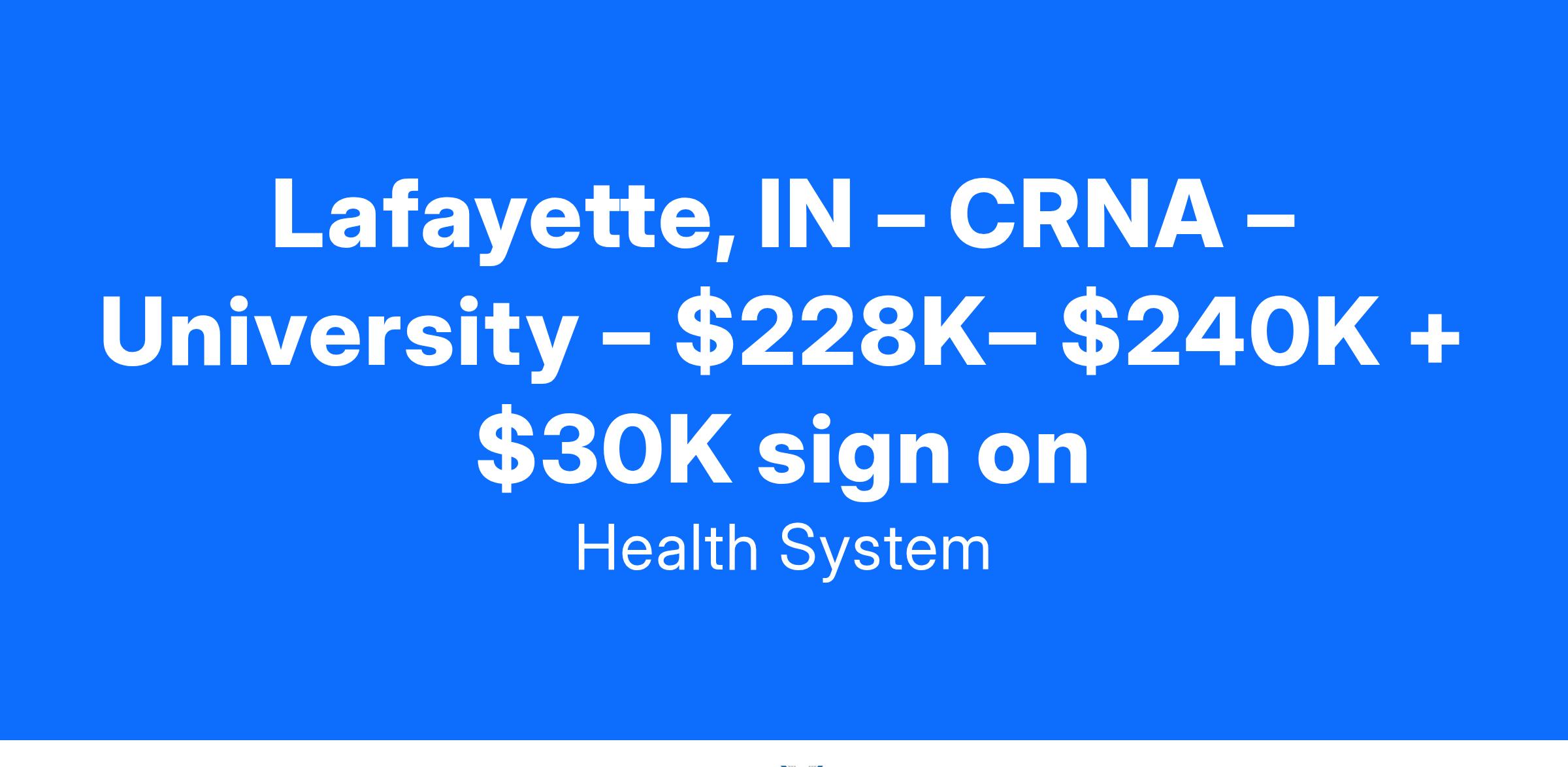 Lafayette, IN – CRNA – University – $228K– $260K + $30K sign on